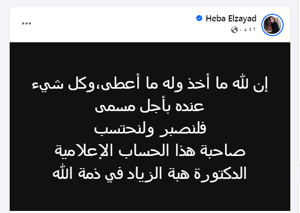 توفيت منذ قليل الإعلامية هبة الزياد وذلك حسبما جاء في منشور على حسابها الموثق “ الفيس بوك”، وتضمن عبار وفاتها وجاء في المنشور: «إن لله ما أخذ وله ما أعطى، وكل شيء عنده بأجل مسمى فلنصبر ونحتسب صاحبة هذا الحساب الإعلامية الدكتورة هبة الزياد في ذمة الله».