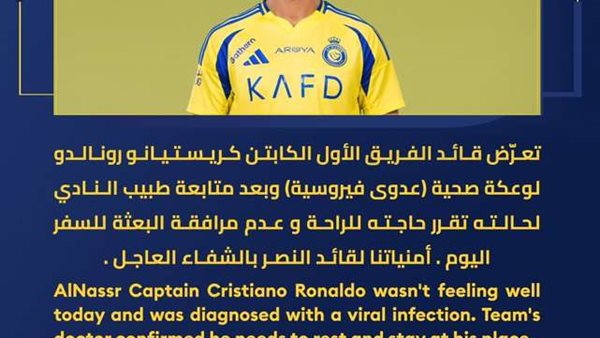 وجاء ذلك عقب إعلان النادي عبر صفحته الرسمية "تعرّض قائد الفريق الأول كريستيانو رونالدو, لوعكة صحية إصابة فيروسية وبعد متابعة الطبيب لحالته تقرر حاجته إلى الراحة التامة وعدم مرافقة بعثة الفريق .