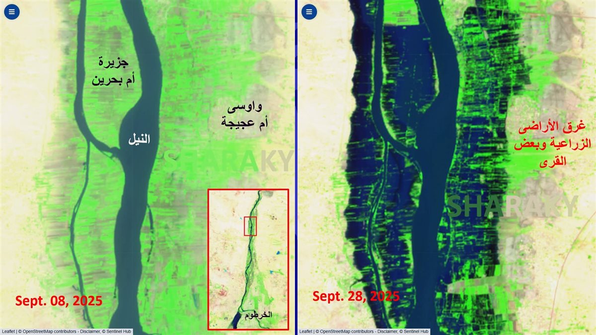 وتظهر الصور الفضائية غمر مياه الفيضان كثير من الأراضى الزراعية وبعض القرى على طول النيل الأزرق ومنطقة الخرطوم والنيل الرئيسى شمال الخرطوم.