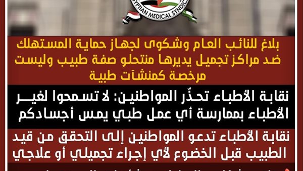 أعلنت نقابة الأطباء عن تقديم بلاغ رسمي إلى النائب العام وشكوى إلى جهاز حماية المستهلك ضد عدد من مراكز التجميل التي تدار بواسطة أشخاص منتحلي صفة طبيب، والتي تعمل دون تراخيص طبية معتمدة.