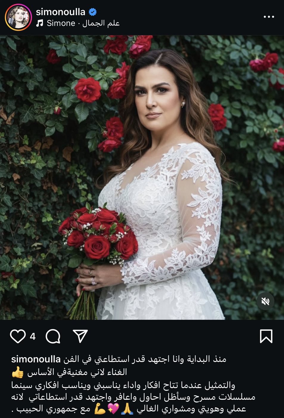 وفي منشور عبر حسابها الرسمي على موقع "إنستجرام"، كتبت سيمون: "منذ البداية وأنا اجتهد قدر استطاعتي في فن الغناء، لأني مغنية في الأساس، والتمثيل عندما تتاح أفكار وأداء يناسبني ويناسب أفكاري، سواء في السينما أو المسلسلات أو المسرح".