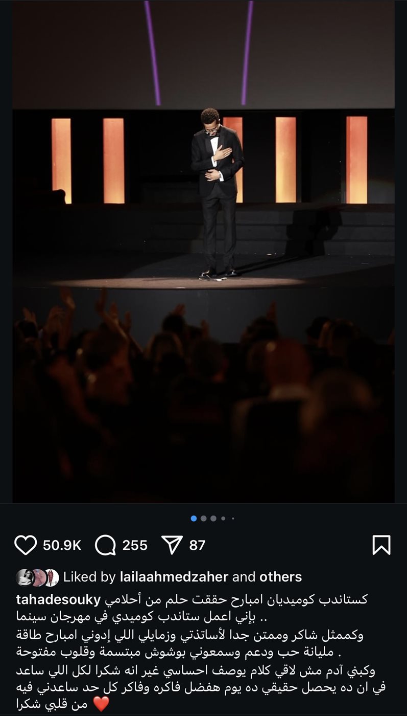 وكتب دسوقي عبر حسابه الرسمي على "إنستجرام": "كستاندب كوميديان امبارح حققت حلما من أحلامي، بإني اعمل ستاندب كوميدي في مهرجان سينما"، مؤكدًا أن التجربة كانت بمثابة خطوة كبيرة على المستوى المهني والشخصي.