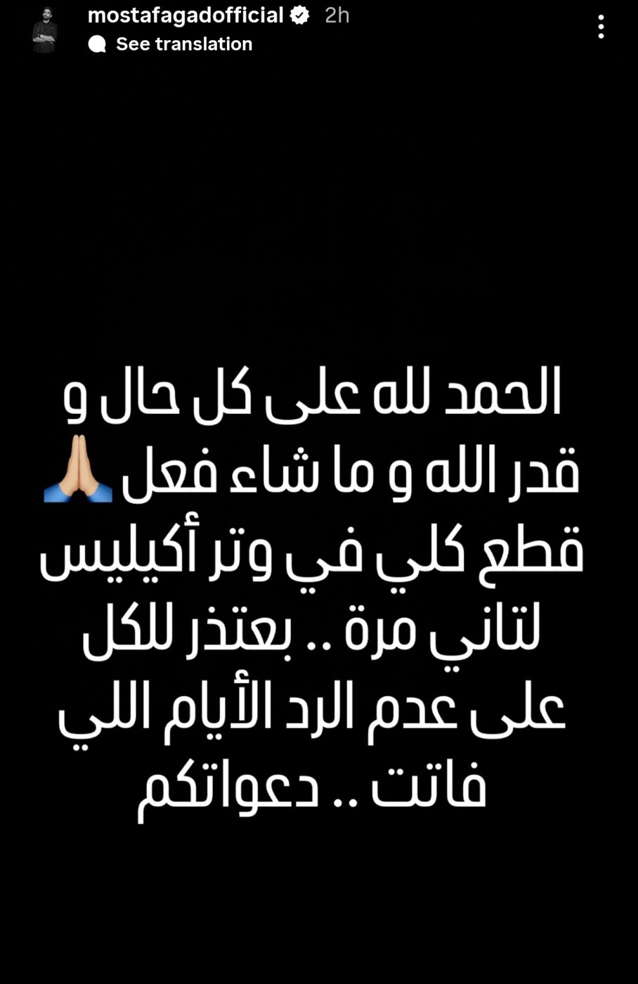 وكتب جاد عبر خاصية "ستوري" على حسابه الرسمي بموقع إنستجرام: "قدر الله وما شاء فعل، قطع كلي في وتر أكيليس لتاني مرة، بعتذر على عدم الرد الأيام اللي فاتت."