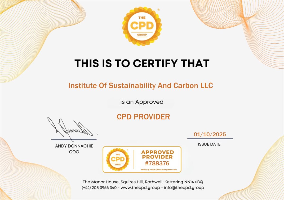 حصل معهد الاستدامة والبصمة الكربونية (Institute of Sustainability and Footprint LLC) على الاعتماد الدولي من هيئة التطوير المهني المستمر البريطانية (UK CPD Certification Service)، كأحد المراكز المعتمدة لتقديم البرامج المهنية المتخصصة في مجالات **الاستدامة، البصمة الكربونية، الاقتصاد الأخضر، الحياد الكربوني، ومعايير ESG الدولية.