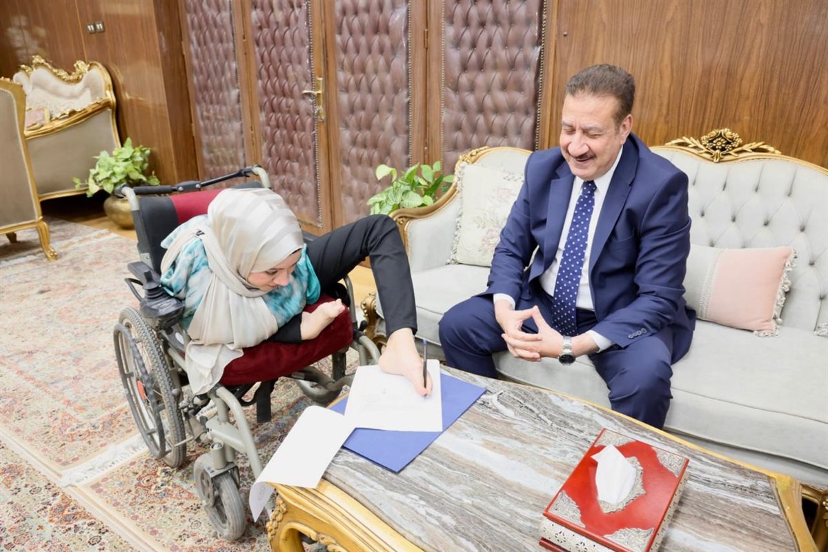 حيث استمع محافظ المنوفية للموهوبة ندى متحدى الإعاقة والتي تبلغ من العمر 27 عاماً حاصلة على ليسانس آداب قسم الاجتماع بجامعة المنوفية ، وأدار حديثاً مفتوحاً معها وعن حياتها الشخصية وطموحاتها ، حيث تتميز بموهبة الرسم على الفحم بقدميها رغم التحديات والصعوبات التي تواجهها.