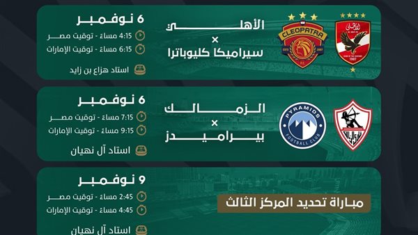 الزمالك × بيراميدز – الساعة 7:15 مساءً بتوقيت القاهرة على استاد آل نهيان في أبوظبي.
