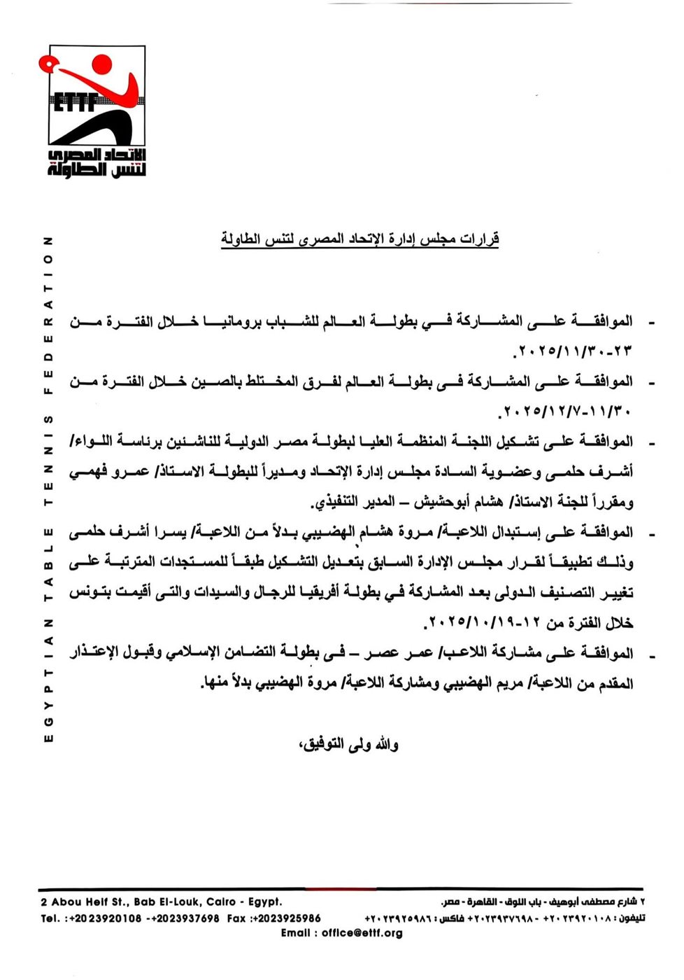 أصدر مجلس إدارة الاتحاد المصري لتنس الطاولة برئاسة اللواء أشرف حلمي، عدة قرارات مهمة خلال اجتماعه الأخير، تضمنت الموافقة على مشاركة المنتخب الوطني في عدد من البطولات الدولية المقبلة، إلى جانب اعتماد بعض التعديلات الإدارية والفنية الخاصة بالمنتخبات.