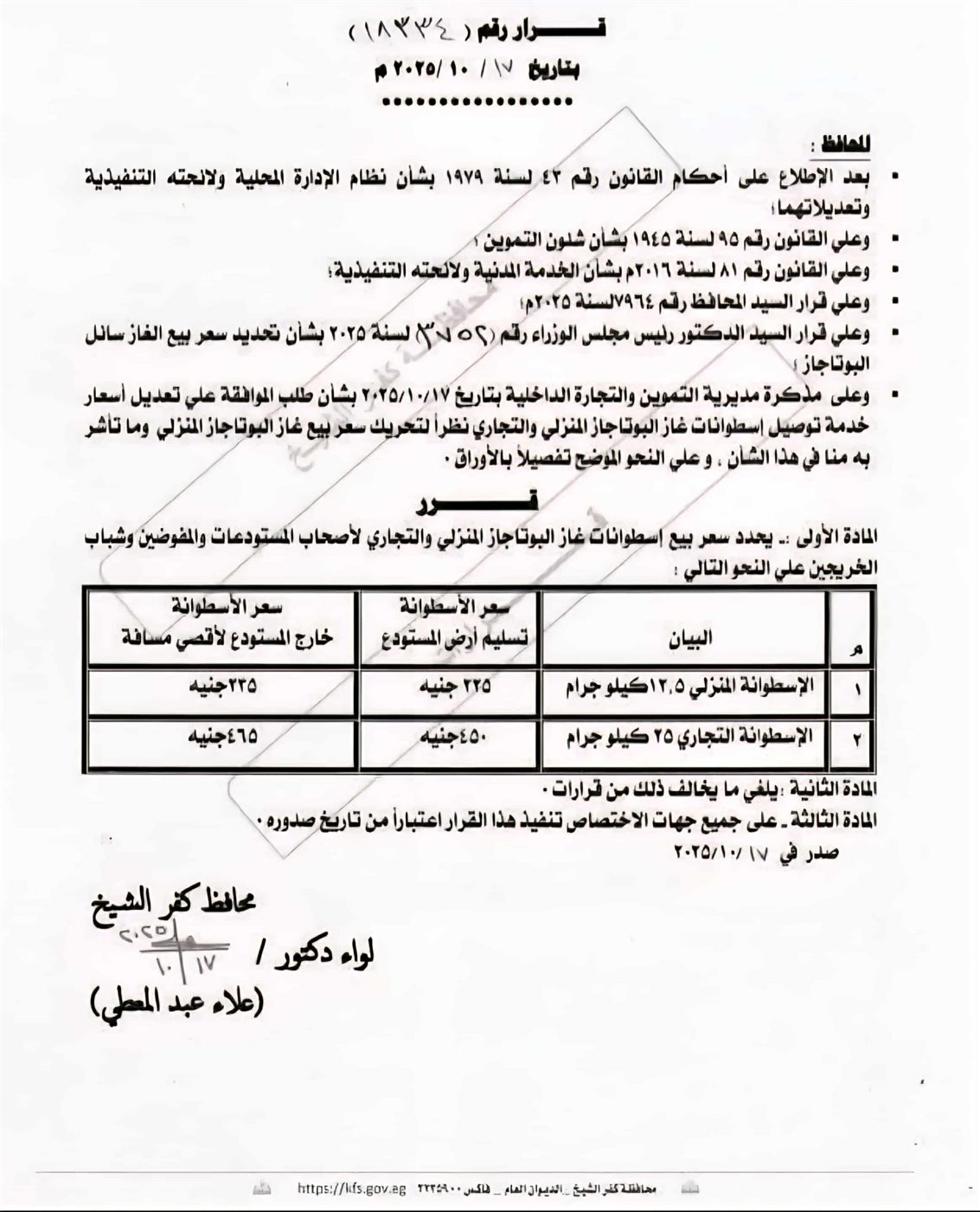 تسود حالة من الغضب بين مواطني محافظة كفر الشيخ، بعد الارتفاع المفاجئ في أسعار أنابيب البوتاجاز، بالرغم من صدور قرار رسمي من محافظ كفر الشيخ اللواء دكتور علاء عبدالمعطي، يحمل رقم (18334) بتاريخ 17 أكتوبر الجاري، يقضي بتحديد سعر الأسطوانة للمستهلك من المستودع بـ225 جنيهًا فقط، على أن تُباع عبر الموزعين الجائلين بسعر 235 جنيهًا.