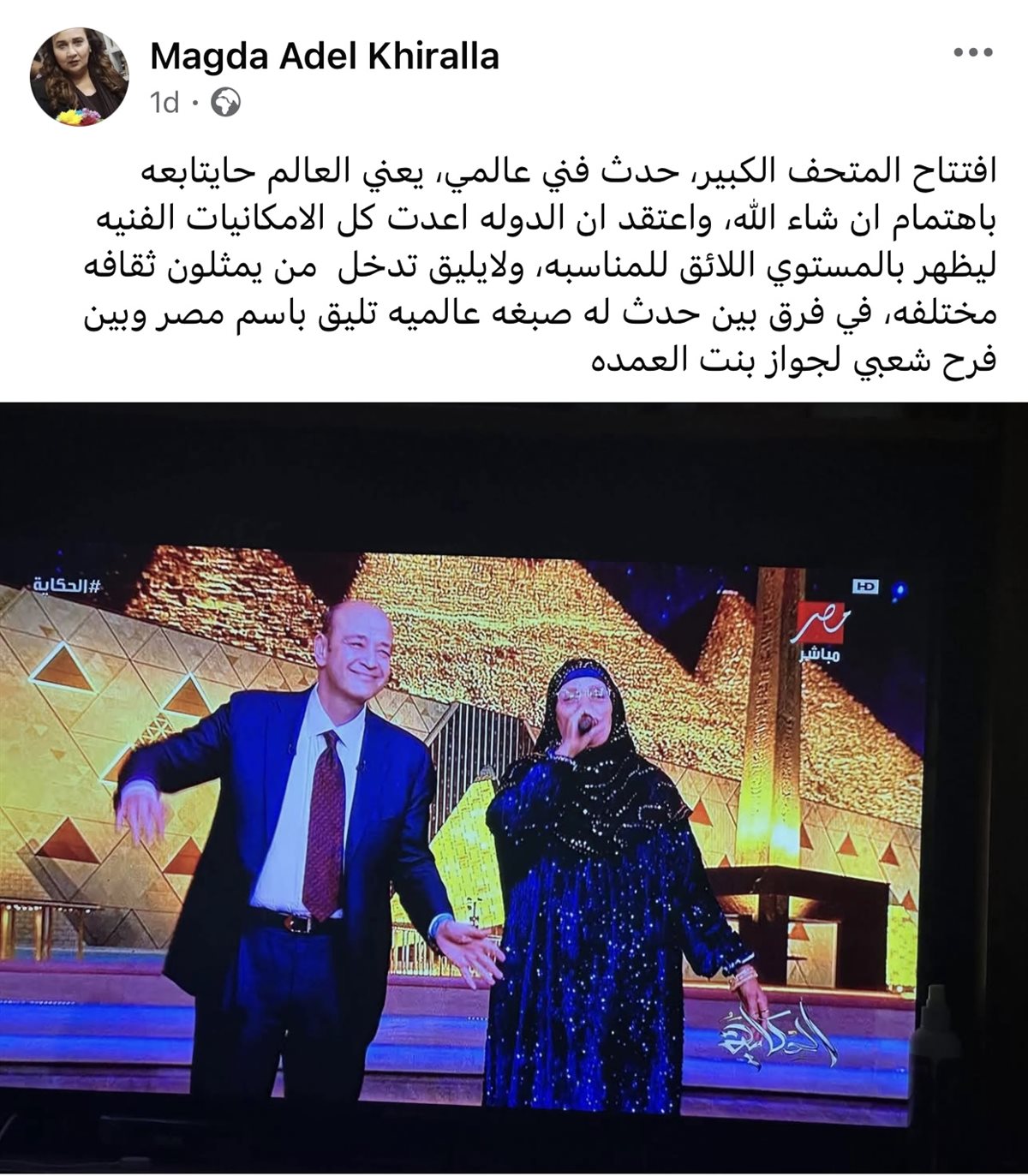 وكتبت خير الله عبر صفحتها الرسمية على "فيسبوك": “افتتاح المتحف الكبير حدث فني عالمي، يعني العالم حايتابعه بإهتمام إن شاء الله، وأعتقد أن الدولة أعدت كل الإمكانيات الفنية ليظهر بالمستوى اللائق للمناسبة، ولا يليق تدخل من يمثلون ثقافة مختلفة... في فرق بين حدث له صبغة عالمية تليق باسم مصر وبين فرح شعبي لجواز بنت العمدة.”