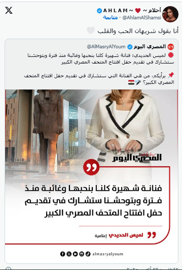 وساهمت الفنانة الإماراتية أحلام الشامسي في تكثيف التوقعات عندما أعادت نشر تصريح لميس الحديدي عبر منصة تويتر معلقة: "أنا بقول شريهان الحب والقلب".