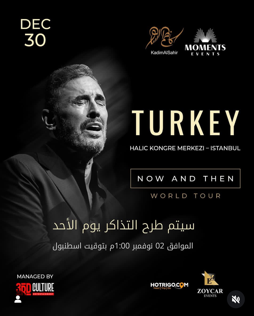 يستعد الفنان كاظم الساهر لإستقبال العام الجديد بسلسلة من الحفلات الغنائية المميزة التي تجمع بين الأناقة الموسيقية والرومانسية المعهودة في أدائه، حيث يحيي حفل ضخم في مدينة إسطنبول التركية يوم 30 ديسمبر المقبل، ضمن فعاليات احتفالات رأس السنة الميلادية.