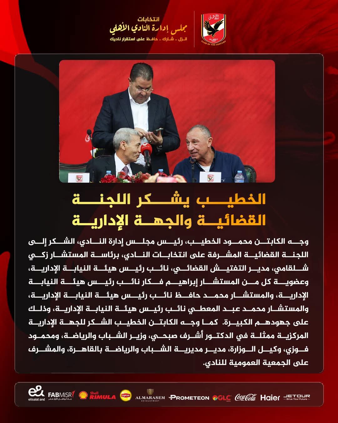 وجه محمود الخطيب، رئيس مجلس إدارة النادي الأهلي ، الشكر إلى اللجنة القضائية المشرفة على انتخابات النادي، برئاسة المستشار زكي شلقامي، مدير التفتيش القضائي، نائب رئيس هيئة النيابة الإدارية، وعضوية كل من المستشار إبراهيم فكار نائب رئيس هيئة النيابة الإدارية، والمستشار محمد حافظ نائب رئيس هيئة النيابة الإدارية، والمستشار محمد عبد المعطي نائب رئيس هيئة النيابة الإدارية، وذلك على جهودهم الكبيرة.