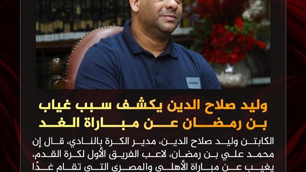 وقال وليد صلاح الدين في تصريحات صحفية: إن محمد علي بن رمضان، لاعب الفريق الأول لكرة القدم، يغيب عن مباراة الأهلي والمصري التي تقام غدًا الأحد، على ملعب الجيش ببرج العرب، ضمن منافسات بطولة الدوري الممتاز، بسبب معاناته من إجهاد في العضلات الخلفية.