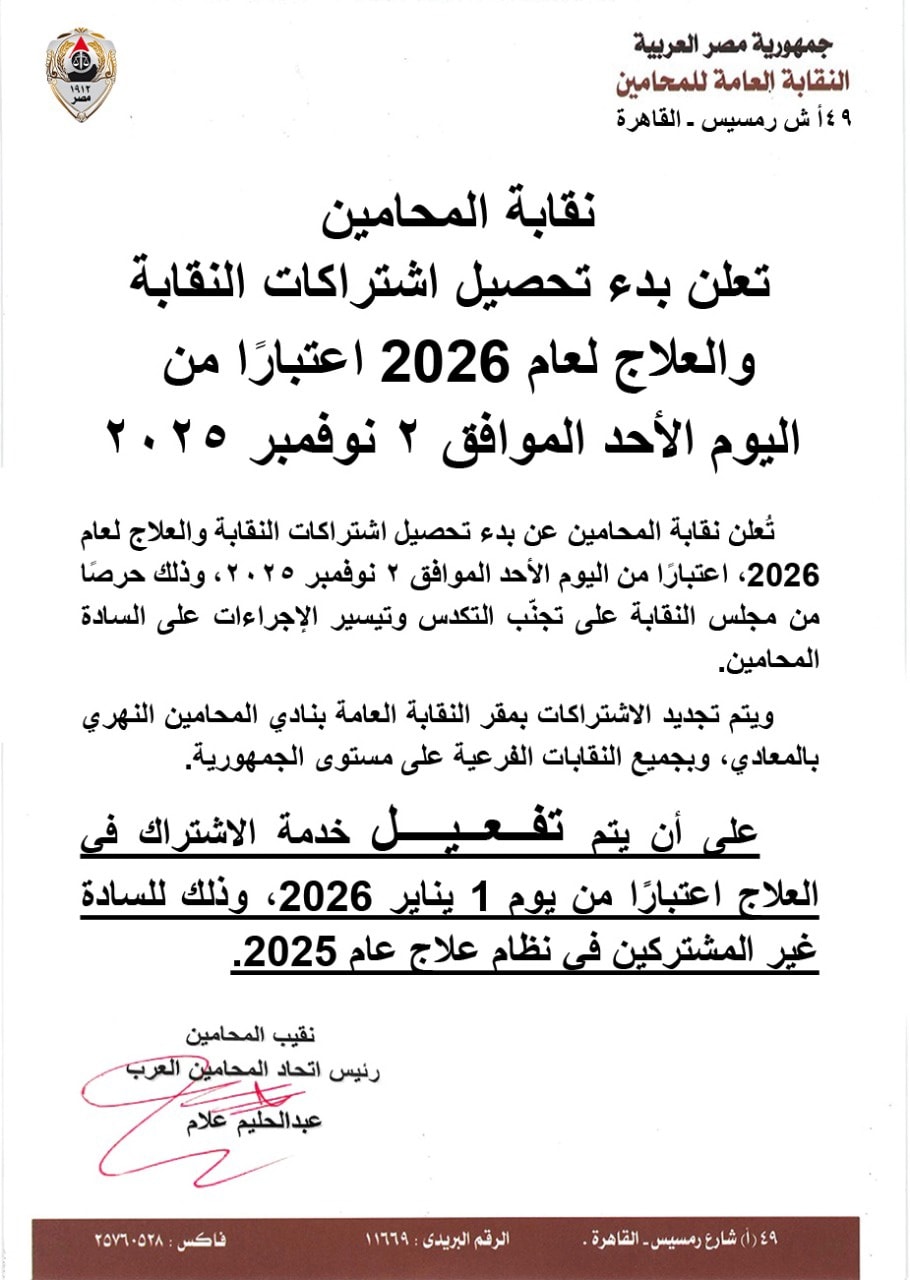 و النقابة السادة المحامين الأعضاء إلى سرعة التوجه لأقرب مقر نقابة فرعية أو النادي النهري بالمعادي لتجديد عضويتهم وسداد اشتراكاتهم قبل نهاية العام، تجنبًا لأي تأخير قد يؤثر على استمرار الاستفادة من الخدمات النقابية ومشروع العلاج.