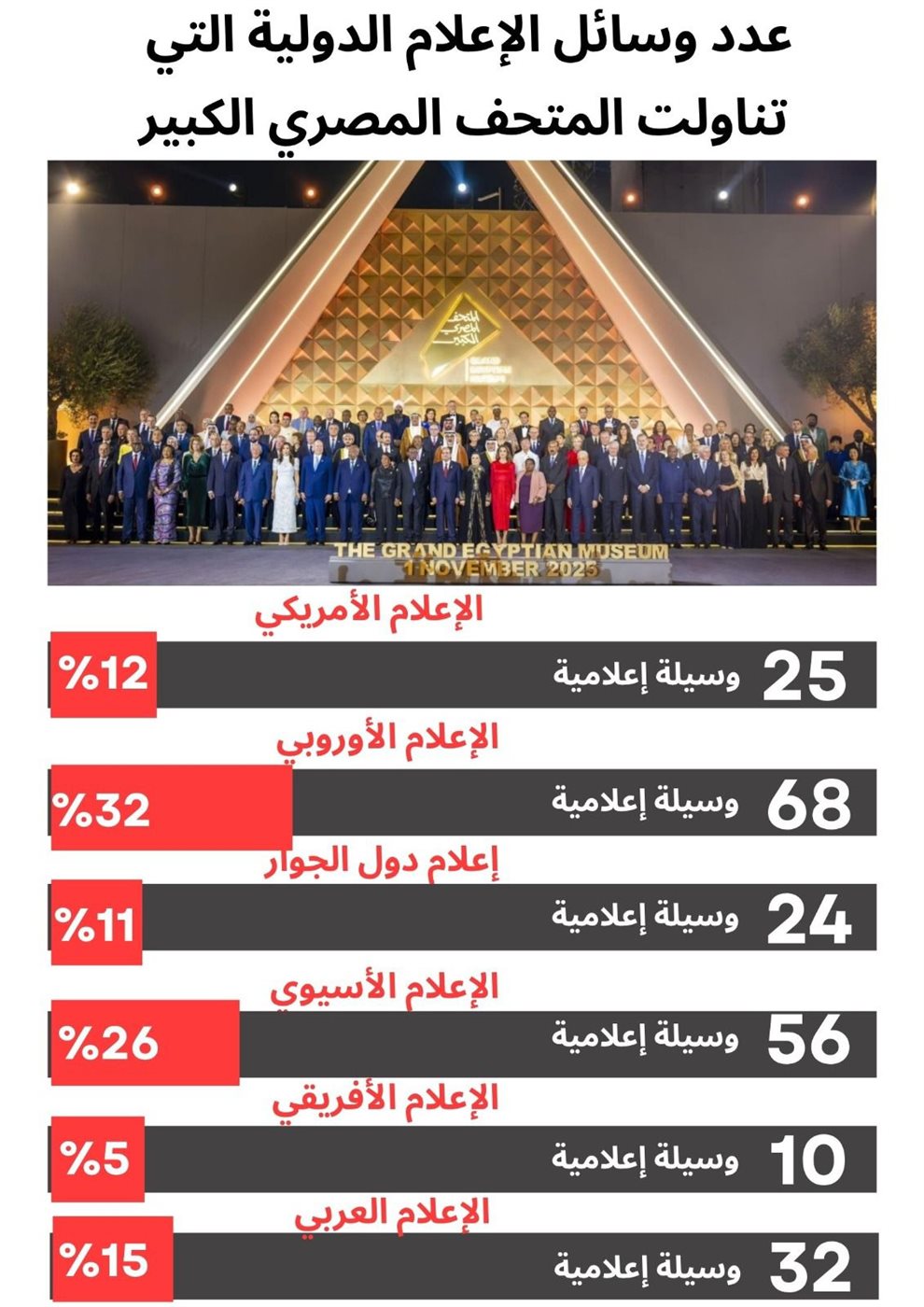 وأكد الإعلام الدولي أن نجاح مصر في صناعة واستضافة حدثين دوليين هامين خلال أقل من شهر، وهما قمة صنع الحضارة بإفتتاح المتحف المصري الكبير، وقمة صنع السلام في شرم الشيخ، التي دعا إليها الرئيس السيسي ورأسها، إلى جانب الرئيس الأمريكي دونالد ترامب، بحضور قادة أكثر من 30 دولة من أنحاء العالم، هو رسالة بأن مصر "صانعة للحضارة وصانعة للسلام"، وفادرة على تحقيق آمال وتطلعات شعبها الكريم وشعوب المنطقة والعالم، أن هذه الحقائق أكدتها كلمات الرئيس السيسي في حفل الإفتتاح بقوله: "أرحب بحضراتكم على أرض مصر أقدم دولة عرفها التاريخ، هنا حيث خطت الحضارة أول حروفها وشهدت الدنيا، ميلاد الفن الفكر والكتابة والعقيدةـ لقد ألهمت مصر القديمة، شعوب الأرض قاطبة ومن ضفاف النيل، انطلقت أنوار الحكمة لتضيء طريق الحضارة والتقدم الإنساني معلنة أن صروح الحضارة، تبنى في أوقات السلام وتنتشر بروح التعاون بين الشعوب". وأكد رئيس هيئة للاستعلامات ان الإعلام الدولي اعتبر المتحف أيقونة معمارية وثقافية تجمع بين عبق الماضي وروح المستقبل، وأن المتحف لا يحمل فقط أبعادًا سياحية أو أثرية، بل رمزية حضارية وإنسانية؛ إذ عرض للمرة الأولى الكنز الكامل للفرعون "توت عنخ آمون"، أكثر من خمسة آلاف قطعة أثرية تم اكتشافها داخل مقبرته الأسطورية، في عرض أبهر العالم. ونشرت الصحف والمواقع الإخبارية ووكالات الانباء الدولية الكبرى، في أمريكا وأوروبا ودول الجوار وآسيا وأفريقيا والعالم العربي قبيل وأثناء وعقب حفل الافتتاح حوالي 705 مادة إعلامية متنوعة توزعت حسب النطاق الجغرافي التي تمثلها، إلى 63 مادة نشرها الإعلام الأمريكي بنسبة 9%، و254 مادة نشرها الإعلام الأوروبي، بنسبة 36%، وتعود تلك النسبة المرتفعة إلى الاهتمام الذي يوليه الإعلام الأوروبي وبخاصة الفرنسي والبريطاني والألماني والإسباني لكل ما هو يتعلق بالسياحة والآثار في مصر بصفة عامة وبافتتاح المتحف المصري الكبير بصفة خاصة ، و44 مادة نشرتها وسائل إعلام دول الجوار، بنسبة 6%، و132 مادة نشرها الإعلام الأسيوي وبخاصة الإعلام الياباني باعتبارها الدولة المساهم الأجنبي الرئيسي في تمويل عملية إنشاء المتحف المصري الكبير، بنسبة 19% ، و18 مادة نشرها الإعلام الأفريقي غالبيتها نقلا عن وكالات أوروبية، بنسبة 3%، و194 مادة نشرها الإعلام العربي وبخاصة السعودي والإماراتي بنسبة بلغت حوالي 28% من إجمالي المواد الإعلامية التي نشرها الإعلام الدولي عن افتتاح المتحف المصري الكبير خلال تلك الفترة. عدد المواد المنشورة عن افتتاح المتحف المصري الكبير في وسائل الإعلام الدولية المنطقة العدد النسبة 1 الإعلام الأمريكي 63 9% 2 الإعلام الأوروبي 254 36% 3 إعلام دول الجوار 44 6% 4 الإعلام الأسيوي 132 19% 5 الإعلام الأفريقي 18 2% 6 الإعلام العربي 194 28% الإجمالي 705 100% ونشرت تلك المواد في وسائل إعلام في الولايات المتحدة وكندا من أمريكا الشمالية والبرازيل والأرجنتين وكولومبيا وكوبا من دول أمريكا اللاتينية، ودول: بريطانيا وفرنسا واسبانيا وألمانيا وإيطاليا وروسيا وبلجيكا واليونان وقبرص وسويسرا وأوكرانيا.. وغيرها من أوروبا، ومن دول الجوار تركيا وإيران وإسرائيل، ومن آسيا دول: الصين والهند وباكستان وماليزيا واليابان وإندونيسيا وفيتنام وأستراليا وكوريا الجنوبية واليابان.. وغيرها، ومن أفريقيا نيجيريا وغانا وأثيوبيا وجنوب أفريقيا والسودان.. وغيرها، وفي معظم وسائل إعلام الدول العربية تقريبا بدون استثناء. الحفل في 215 صحيفة وموقعاً عالمياً بلغ عدد وسائل الإعلام الدولية الكبري ذات الأهمية والانتشار التي تناولت افتتاح المتحف المصري الكبير حوالي215 وسيلة إعلامية، منها: 25 وسائل إعلام أمريكية، بنسبة 12%، و68 وسيلة إعلامية أوروبية، بنسبة 32%، و24 وسيلة إعلامية من دول الجوار، بنسبة 11%، و56 وسيلة إعلامية أسيوية، بنسبة 26%، 10 وسائل من الإعلام الأفريقي، بنسبة 5%، و32 وسيلة إعلامية من العالم العربي بنسبة 15%، مع ملاحظة عدم تكرار الوسائل التي تن