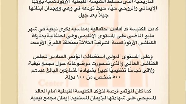- ودور آباء الكنيسة القبطية في صياغة العقيدة الأرثوذكسية وستنظم الكنيسة الأرثوذكسية احتفالية كبرى بمناسبة مرور 17 قرن ا على انعقاد مجمع نيقية المسكوني الأول