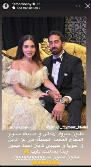 وفي هذا السياق، نشر تامر حسني عبر خاصية “الستوري” على حسابه الرسمي في “إنستجرام” مجموعة صور للعروسين، وأرفقها برسالة محبة قال فيها: "مليون مبروك لأختي وصديقة مشوار النجاح، النجمة الجميلة مي عز الدين، وأخويا وحبيبي كابتن أحمد تيمور خليل، ربنا يسعدكم يا رب ومليون مبروك".