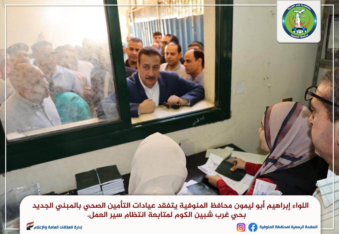 في ضوء تنفيذ توجيهات اللواء إبراهيم أبو ليمون محافظ المنوفية خلال زيارته التفقدية لعيادات التأمين الصحي بالمبنى الجديد بحي غرب شبين الكوم للوقوف علي مدي انتظام سير العمل وضمان تلبية احتياجات المنتفعين .