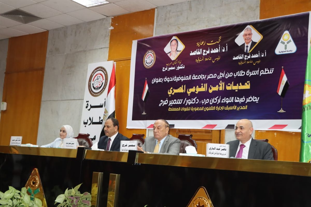 نظمت أسرة طلاب من أجل مصر اليوم ندوة تثقيفية مهمة حول "تحديات الامن القومي المصري"؛ لغرس روح الانتماء الوطني والفخر بتاريخ القوات المسلحة لدى الطلاب بجامعة المنوفية وربطهم بقيم التضحية والفداء، وذلك تحت رعاية الدكتور أحمد القاصد رئيس جامعة المنوفية.