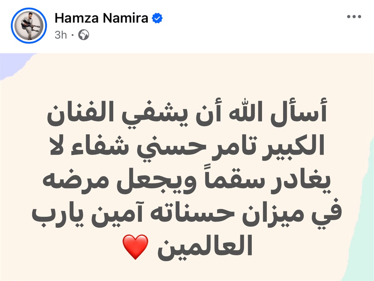 وكتب نمرة عبر حسابه على موقع فيسبوك دعاء قال فيه: “أسأل الله أن يشفي الفنان الكبير تامر حسني شفاء لا يغادر سقما ويجعل مرضه في ميزان حسناته، آمين يا رب العالمين.”