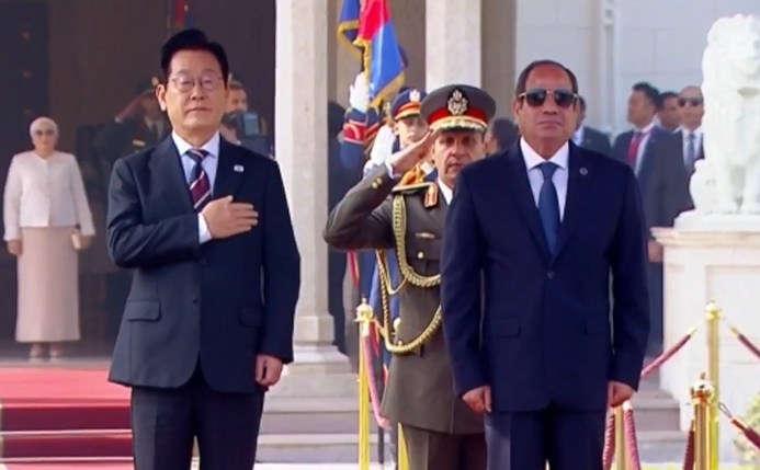 استقبل الرئيس عبد الفتاح السيسي والسيدة انتصار السيسي، صباح اليوم الخميس، رئيس جمهورية كوريا الجنوبية لي جاى ميونج وقرينته، وذلك في قصر الاتحادية، حيث جرت مراسم استقبال رسمية للضيف الكوري. وشملت المراسم عزف النشيدين الوطنيين للبلدين واستعراض حرس الشرف.