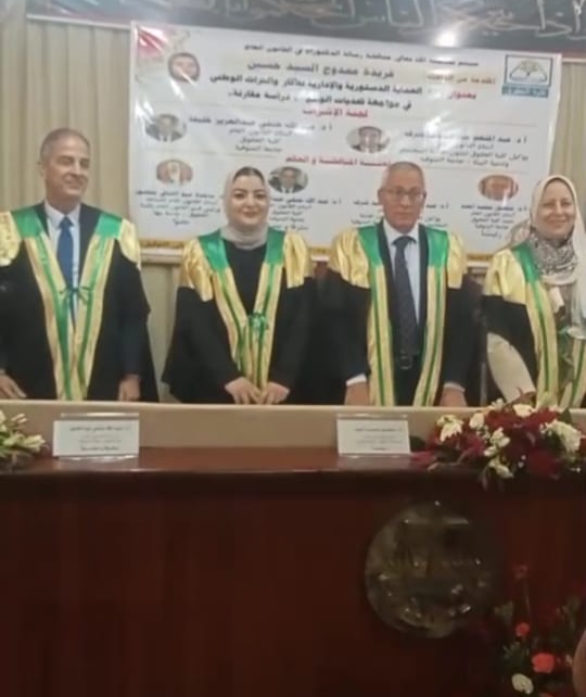 تألفت لجنة الحكم من نخبة أساتذة القانون بجامعتي المنوفية وبنها، وأثنت اللجنة على القيمة العلمية للرسالة وعمق معالجتها للتحديات الدستورية والإدارية. وفي ختام اللقاء، تسلّم الدكتور زاهي حواس نسخة من الرسالة تقديرًا لجهود الباحثة، مؤكدًا أهمية الربط بين البحث الأكاديمي والتطبيق العملي في حماية التراث المصري.