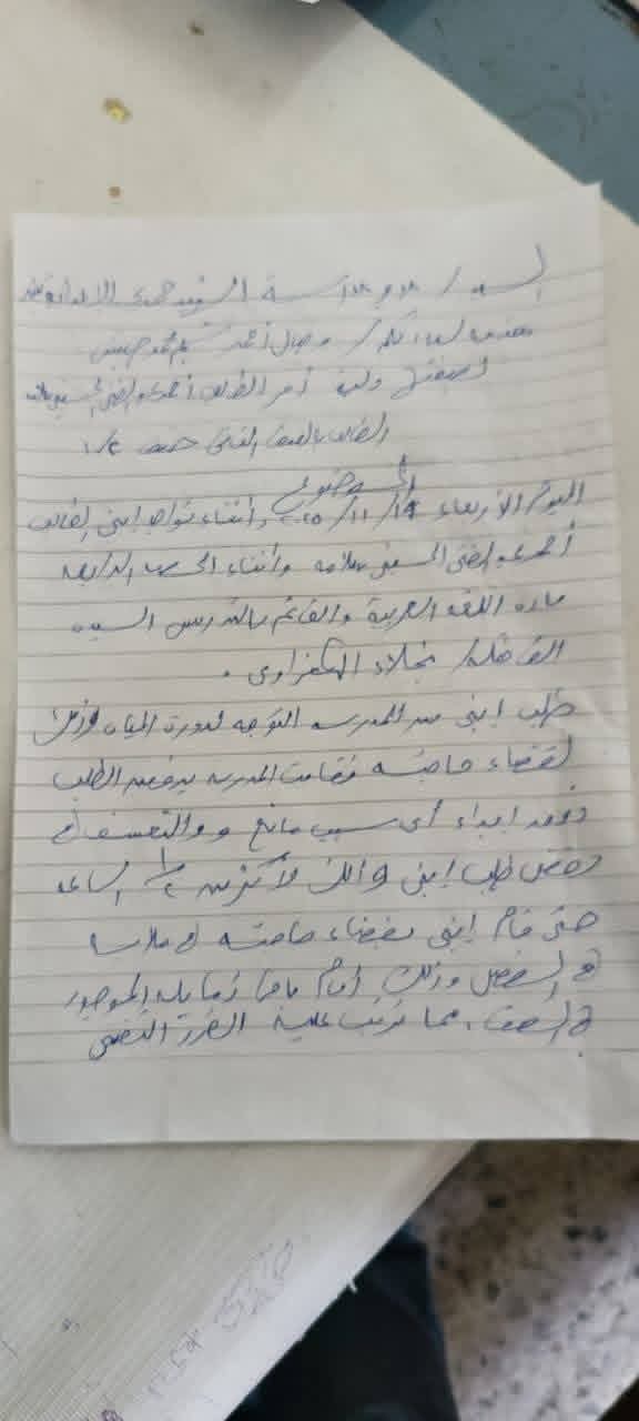 تقدمت سيدة من محافظة كفر الشيخ بمذكرة رسمية إلى وكيل وزارة التربية والتعليم بالمحافظة، تستغيث فيها من تصرّف «إحدى المدرسات» بمدرسة الشهيد حمدي الإعدادية، بعد تعرض نجلها الطالب بالصف الثاني الإعدادي لموقف وصفته بـ«المؤلم والمُهين» أمام زملائه داخل الفصل.