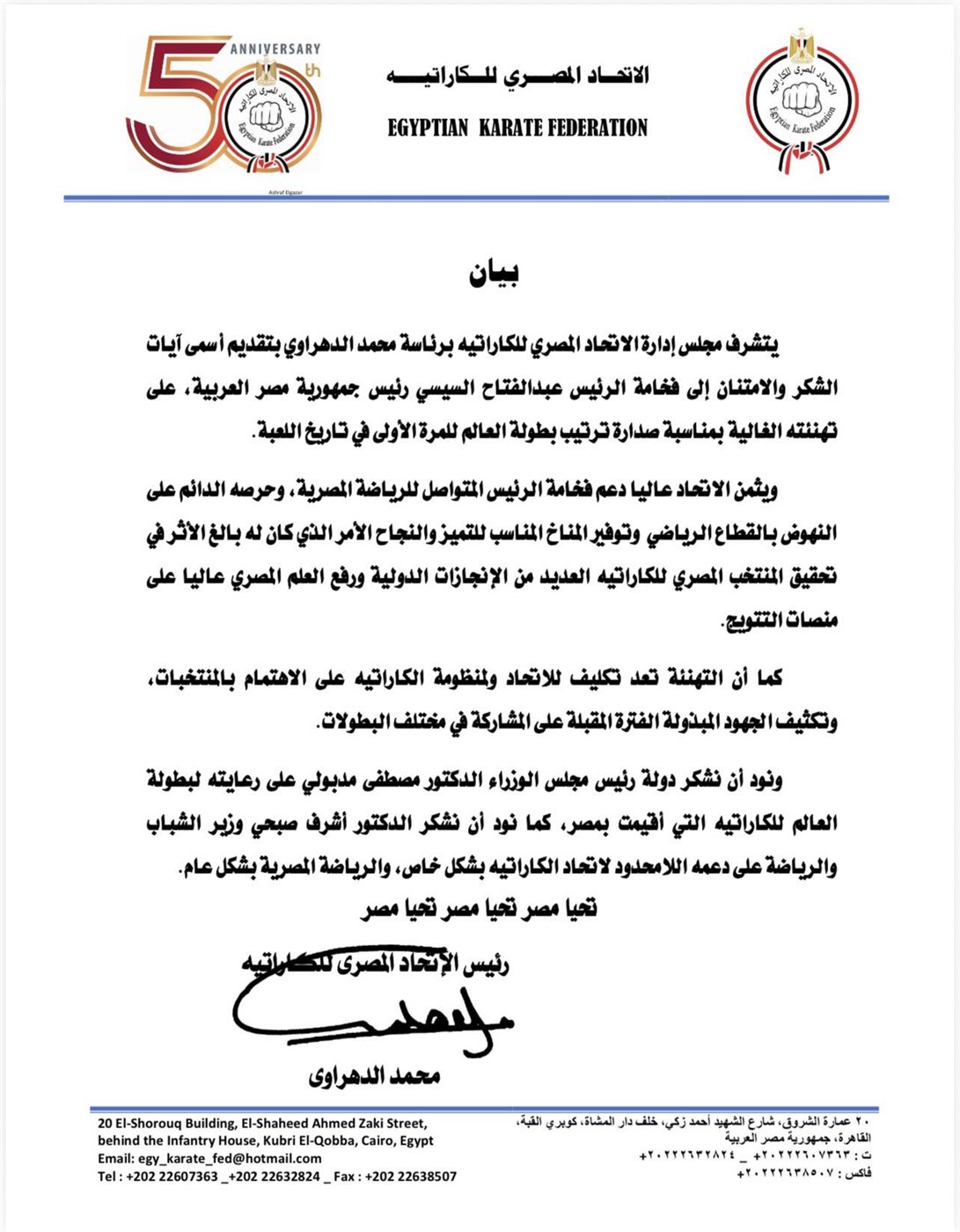 أصدر مجلس إدارة الاتحاد المصري للكاراتيه برئاسة محمد الدهراوي بيانًا رسميًا قدّم خلاله أسمى آيات الشكر والامتنان إلى فخامة الرئيس عبد الفتاح السيسي، رئيس جمهورية مصر العربية، على تهنئته الغالية بمناسبة تصدر المنتخب الوطني للكاراتيه ترتيب بطولة العالم للمرة الأولى في تاريخ اللعبة.