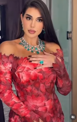 أما الفستان الأحمر الذي ظهرت به، والمزين بتفاصيل تشبه الأوراق مع أكمام طويلة منحته لمسة فخامة إضافية، فهو من تصميم المصمم اللبناني جان بيار خوري (Jean-Pierre Khoury).