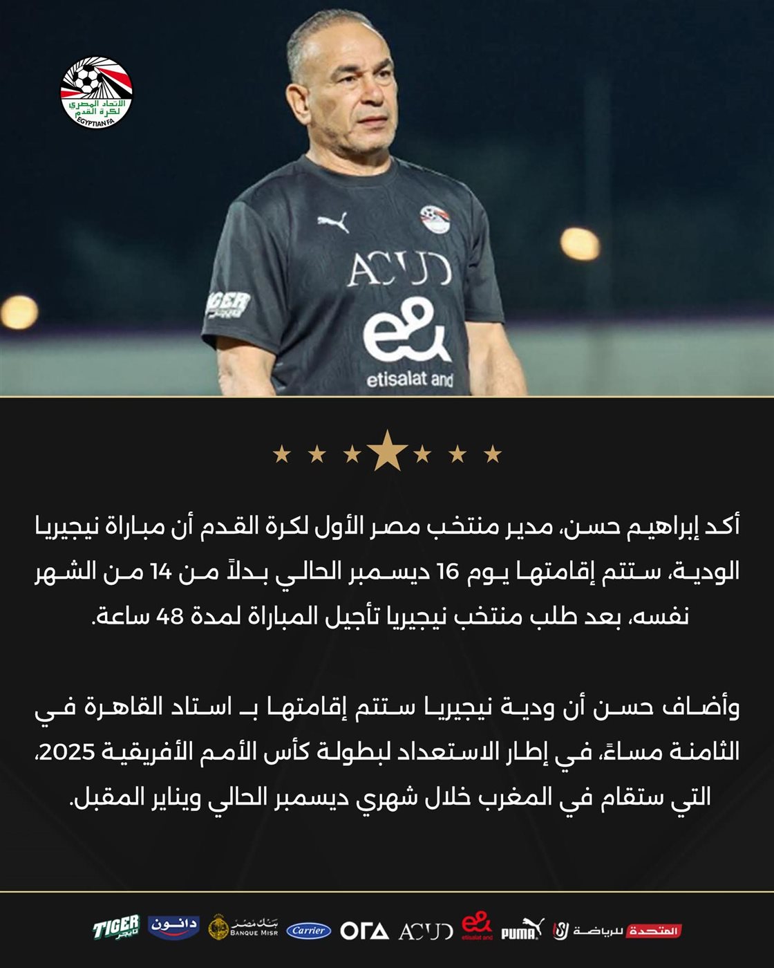 أعلن إبراهيم حسن مدير المنتخب المصري عن موعد مباراة الفراعنة الودية أمام منتخب نيجيريا الودية في إطار الاستعدادات لبطولة كأس الأمم الإفريقية بالمغرب.