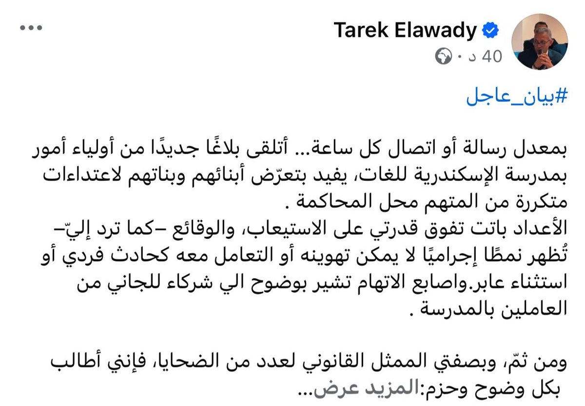 بلاغات متزايدة عن اعتداءات مدرسة الإسكندرية للغات.. وطارق العوضي يوجه نداءً عاجلًا