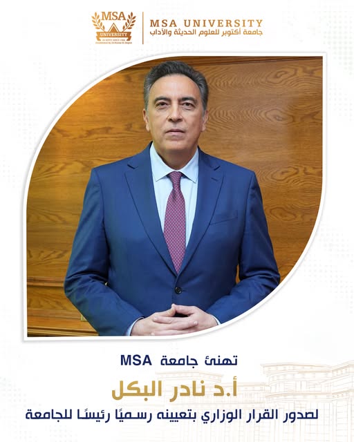 وفي هذا الصدد، تقدمت أسرة جامعة أكتوبر للعلوم الحديثة والآداب (MSA) بكل الفخر والاعتزاز، من أعضاء هيئة التدريس والهيئة المعاونة والعاملين والطلاب بخالص التهنئة للدكتور نادر البكل، متمنّين لسيادته كل التوفيق والسداد، ومعربين عن ثقتهم الكاملة في قيادته للجامعة نحو مرحلة جديدة من التميّز والريادة والإنجازات المستدامة.