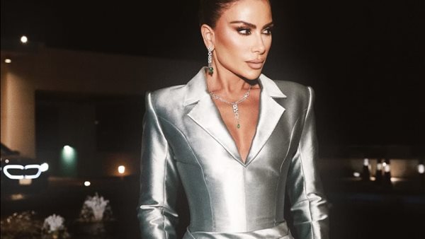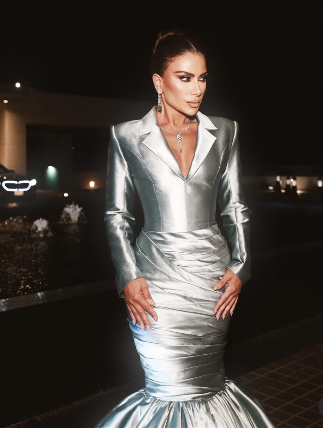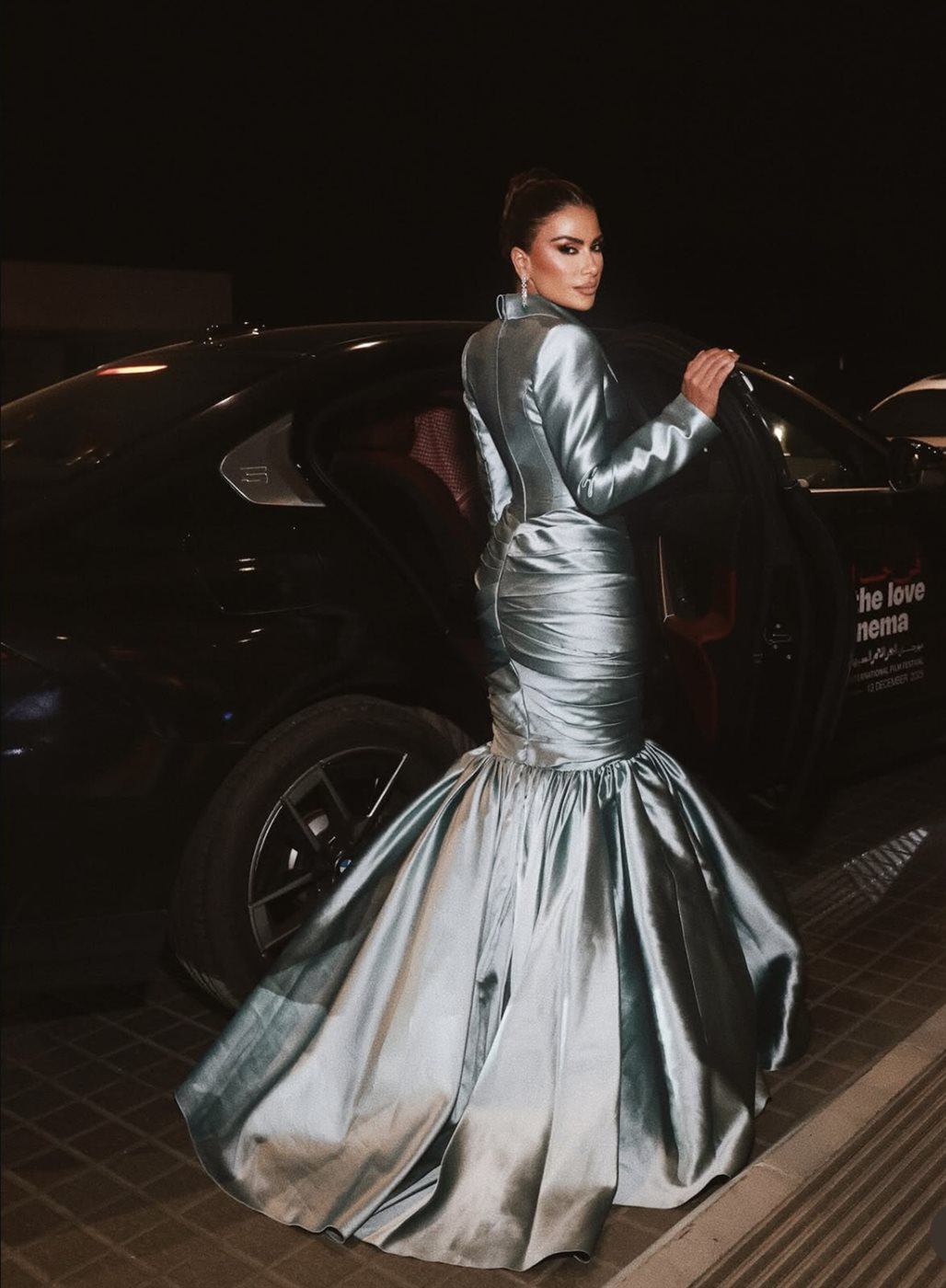 ظهرت صبا مبارك بفستان لامع من قماش الساتان الفضي، صمم بقصة ضيقة تبرز تفاصيل قوامها، مع كتفين بارزين وياقة مفتوحة أضفت على الإطلالة لمسة جريئة.