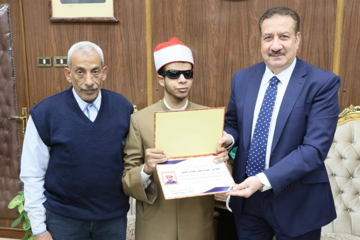 و أهداه محافظ المنوفية مكافأة مالية وشهادة تقدير لتفوقه في واحدة من أعرق المسابقات القرآن الدولية، معرباً عن بالغ فخره واعتزازه بهذا التفوق الذى حققه رغم التحديات والصعوبات لفقدانه نعمة البصر، حيث يعد نموذجاً يحتذي به في العزيمة والإصرار ومؤكداً حرصه على دعمه الكامل لذوى الهمم وتقديم أوجه الرعاية المباشرة كونهم جزء أساسي وأصيل في المجتمع تنفيذاً لتوجيهات القيادة السياسية.
