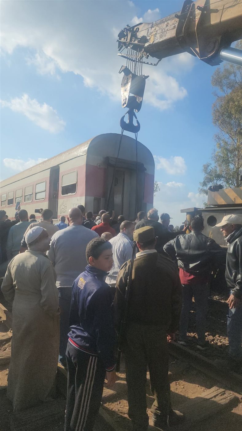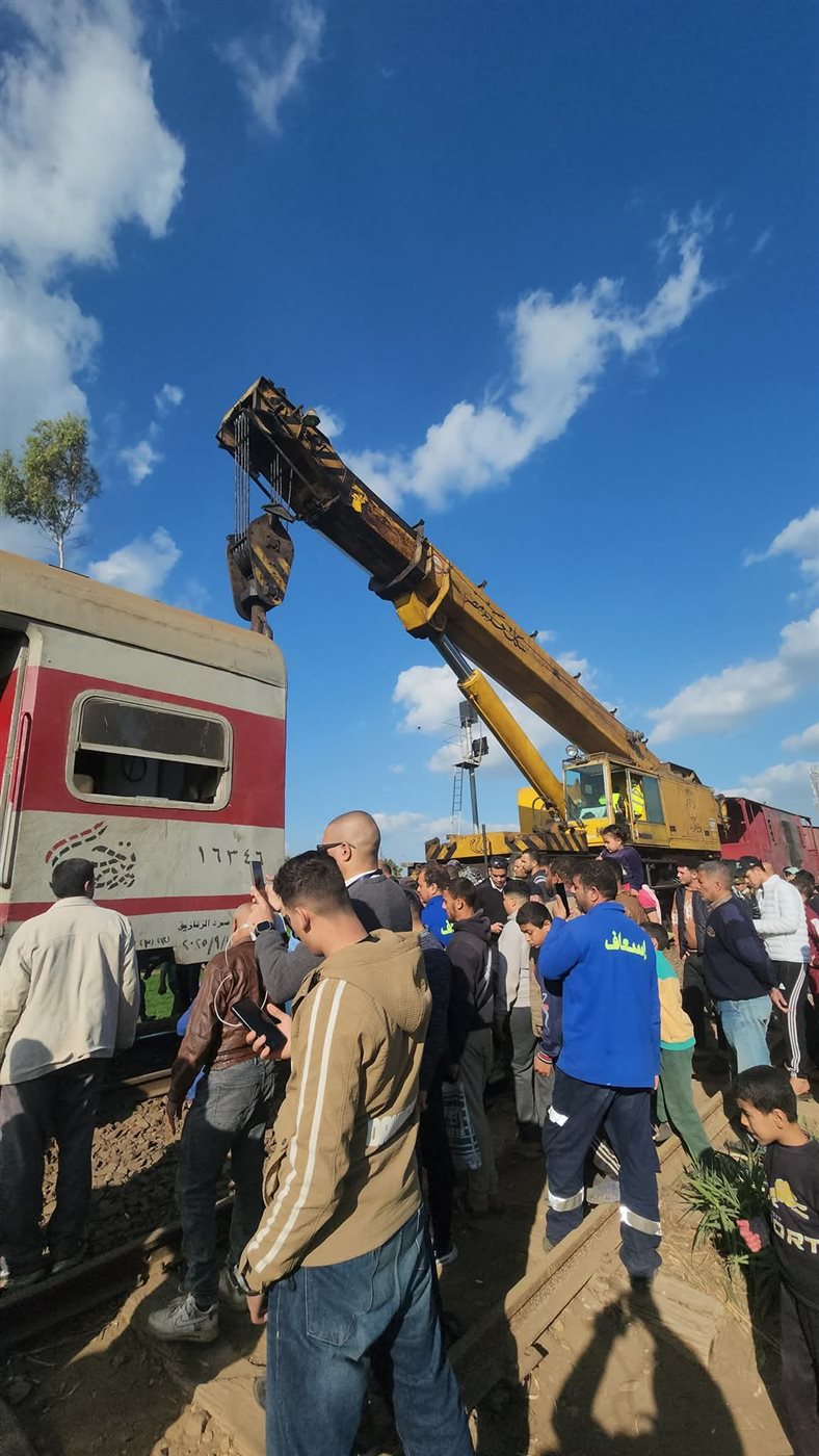 توجه ونش عملاق لرفع عربة القطار رقم ٥٤٤، المتجه من طنطا إلى القاهرة، عن القضبان صباح اليوم بالقرب من محطة قطار الحامول، في حادث مفاجئ أثار حالة من القلق بين الركاب .