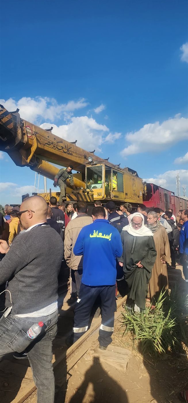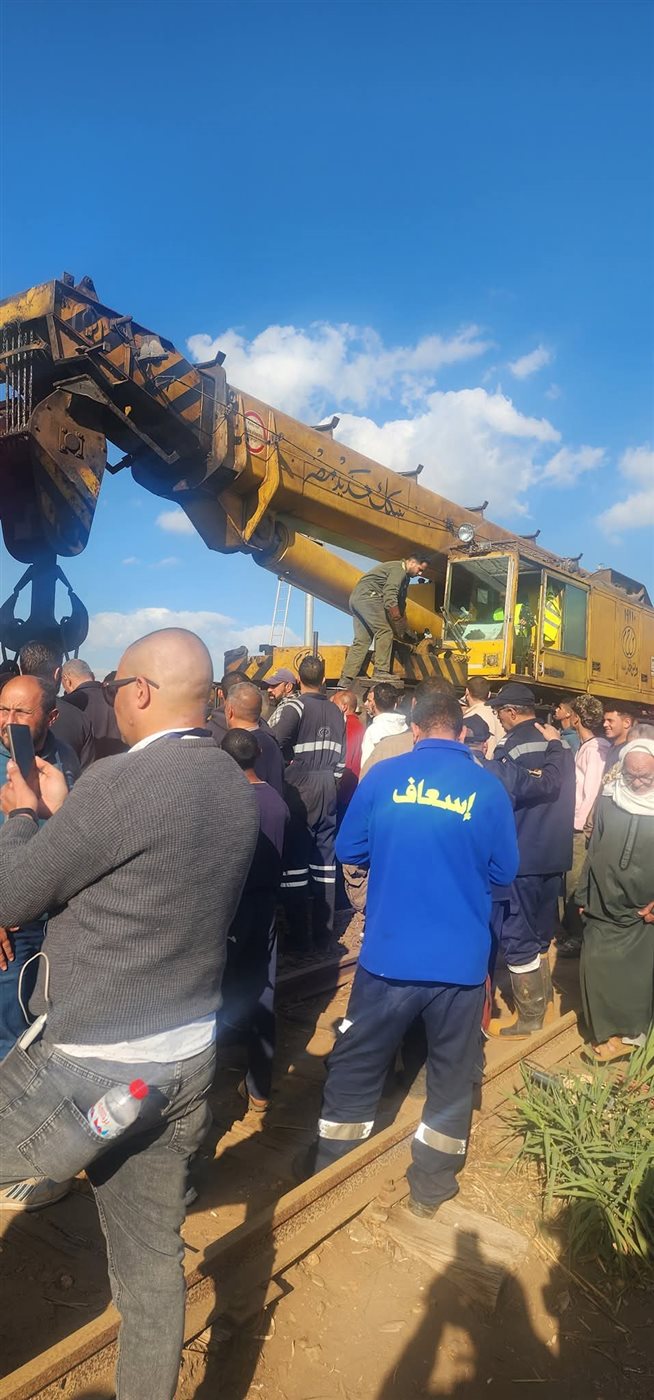ونش عملاق لرفع عربة القطار بعد خروجها من القضبان بالمنوفية ( صور )