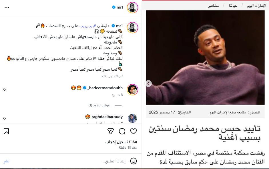 وكتب محمد رمضان تعليق قال فيه: “الحمد لله.. الحكم مع إيقاف التنفيذ.. تحيا مصر”، وهو التعليق الذي تفاعل معه عدد كبير من متابعيه على مواقع التواصل الاجتماعي، بين مؤيد ومتحفظ.