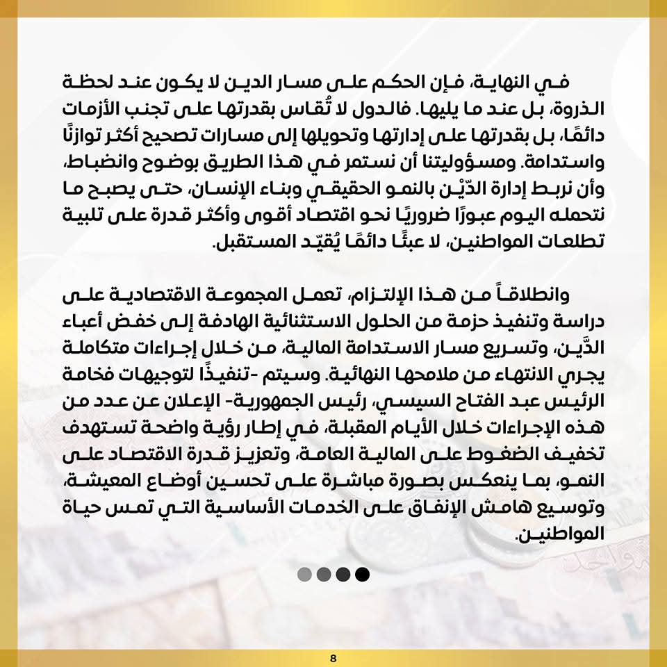 وانطلاقًا من هذا الالتزام، تعمل المجموعة الاقتصادية على دراسة وتنفيذ حزمة من الحلول الاستثنائية الهادفة إلى خفض أعباء الدّيْن، وتسريع مسار الاستدامة المالية، من خلال إجراءات متكاملة يجري الانتهاء من ملامحها النهائية، وسيتم –تنفيذا لتوجيهات فخامة الرئيس عبدالفتاح السيسي، رئيس الجمهورية– الإعلان عن عدد من هذه الإجراءات خلال الأيام المقبلة، في إطار رؤية واضحة تستهدف تخفيف الضغوط على المالية العامة، وتعزيز قدرة الاقتصاد على النمو، بما ينعكس بصورة مباشرة على تحسين أوضاع المعيشة، وتوسيع هامش الإنفاق على الخدمات الأساسية التي تمس حياة المواطنين.