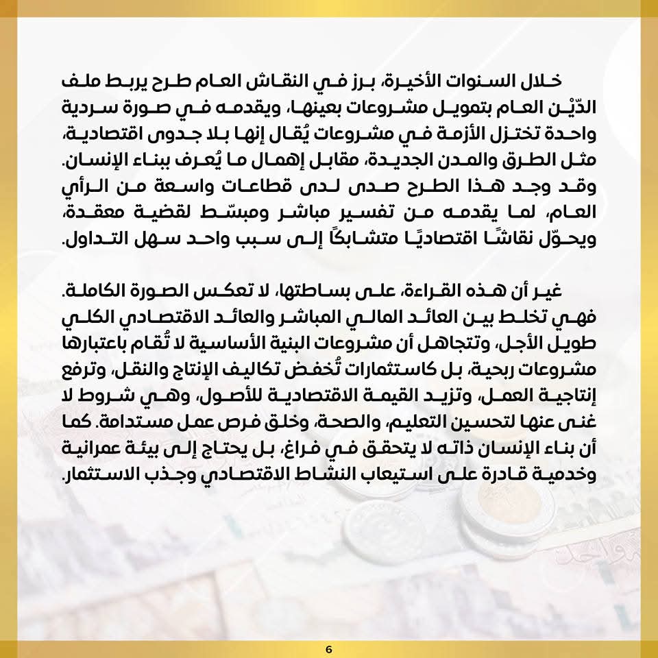 كما يتجاهل هذا الطرح أن الدّيْن لم يكن نتاج هذه المشروعات وحدها، بل تَشكّل في سياق صدمات خارجية متلاحقة فرضت على الدولة تمويل فجوات قائمة للحفاظ على الاستقرار الاقتصادي والاجتماعي، فضلًا عن ذلك، لم يتوقف الإنفاق الاجتماعي، لكنه تعرض لضغوط قللت من أثره الظاهر بسبب التضخم والنمو السكاني، ومن ثم، فإن اختزال أزمة الدّيْن في «طرق وكباري» لا يقدم تشخيصًا دقيقًا بقدر ما يُبعد النقاش عن السؤال الأهم: كيف نُحوّل ما أُنجز من استثمارات مادية إلى قاعدة إنتاجية حقيقية تعزز بناء الإنسان، بدل وضع الاستثمار في الحجر والاستثمار في البشر في مواجهة زائفة.