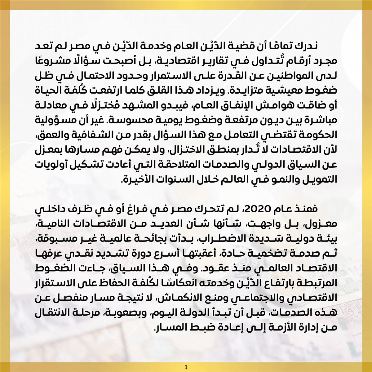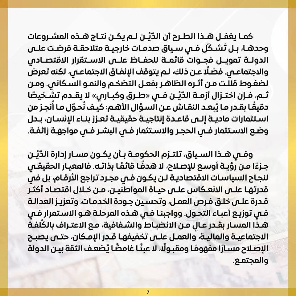 وفي هذا السياق، تلتزم الحكومة بأن يكون مسار إدارة الدّيْن جزءًا من رؤية أوسع للإصلاح، لا هدفًا قائمًا بذاته، فالمعيار الحقيقي لنجاح السياسات الاقتصادية لن يكون في مجرد تراجع الأرقام، بل في قدرتها على الانعكاس على حياة المواطنين، من خلال اقتصاد أكثر قدرة على خلق فرص العمل، وتحسين جودة الخدمات، وتعزيز العدالة في توزيع أعباء التحول، وواجبنا في هذه المرحلة هو الاستمرار في هذا المسار بقدر عالٍ من الانضباط والشفافية، مع الاعتراف بالكُلفة الاجتماعية والمالية، والعمل على تخفيفها قدر الإمكان، حتى يصبح الإصلاح مسارًا مفهومًا ومقبولًا، لا عبئًا غامضًا يُضعف الثقة بين الدولة والمجتمع.