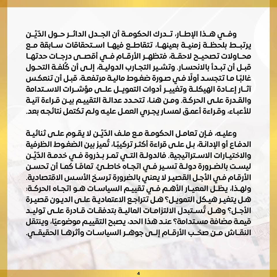 ويبقى التحدي الأكبر أمام الحكومة هو كيفية إدارة هذه اللحظة مع الرأي العام، ليس عبر التقليل من حجم العبء أو إنكاره، بل عبر وضعه في سياقه الصحيح، وشرح أسبابه وحدوده، والمسار المتوقع لتفكيكه، فالأزمات المالية لا تُقاس فقط بحدّة أرقامها، بل بقدرة الدولة على تحويلها من نقطة ضعف إلى دافع لإعادة الانضباط، ومن ضغط آني إلى مسار تصحيحي طويل النفس، يُقاس نجاحه بمرور الوقت وبالأثر الحقيقي، لا بلحظة واحدة.