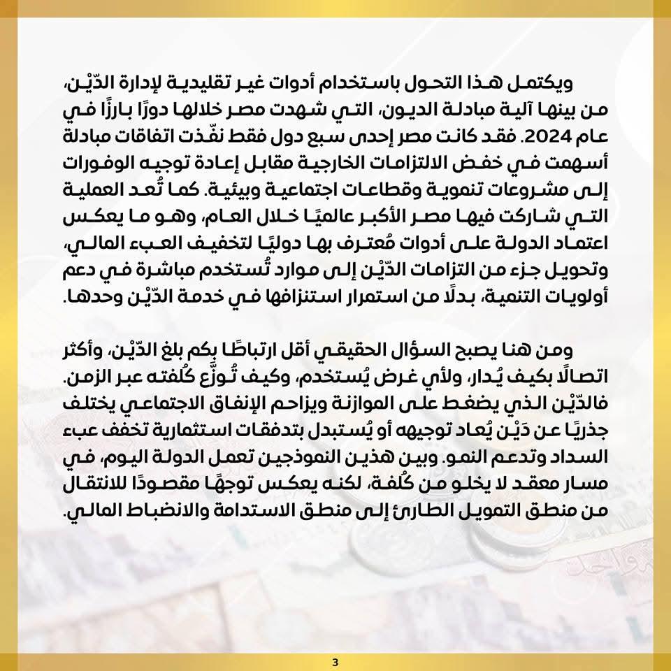 ويكتمل هذا التحول باستخدام أدوات غير تقليدية لإدارة الدّيْن، منها آلية مبادلة الديون، التي شهدت مصر خلالها دورًا بارزًا في عام 2024، فقد كانت مصر واحدة من سبع دول فقط نفذت اتفاقات مبادلة ساهمت في خفض الالتزامات الخارجية مقابل إعادة توجيه الوفورات إلى مشروعات تنموية وقطاعات اجتماعية وبيئية، وكانت العملية التي شاركت فيها مصر هي الأكبر عالميًا خلال العام، مما يعكس اعتماد الدولة على أدوات معترف بها دوليًا لتخفيف العبء المالي، وتحويل جزء من التزامات الدّيْن إلى موارد تُستخدم مباشرة في دعم أولويات التنمية، بدلًا من استمرار استنزافها في خدمة الدّيْن فقط.