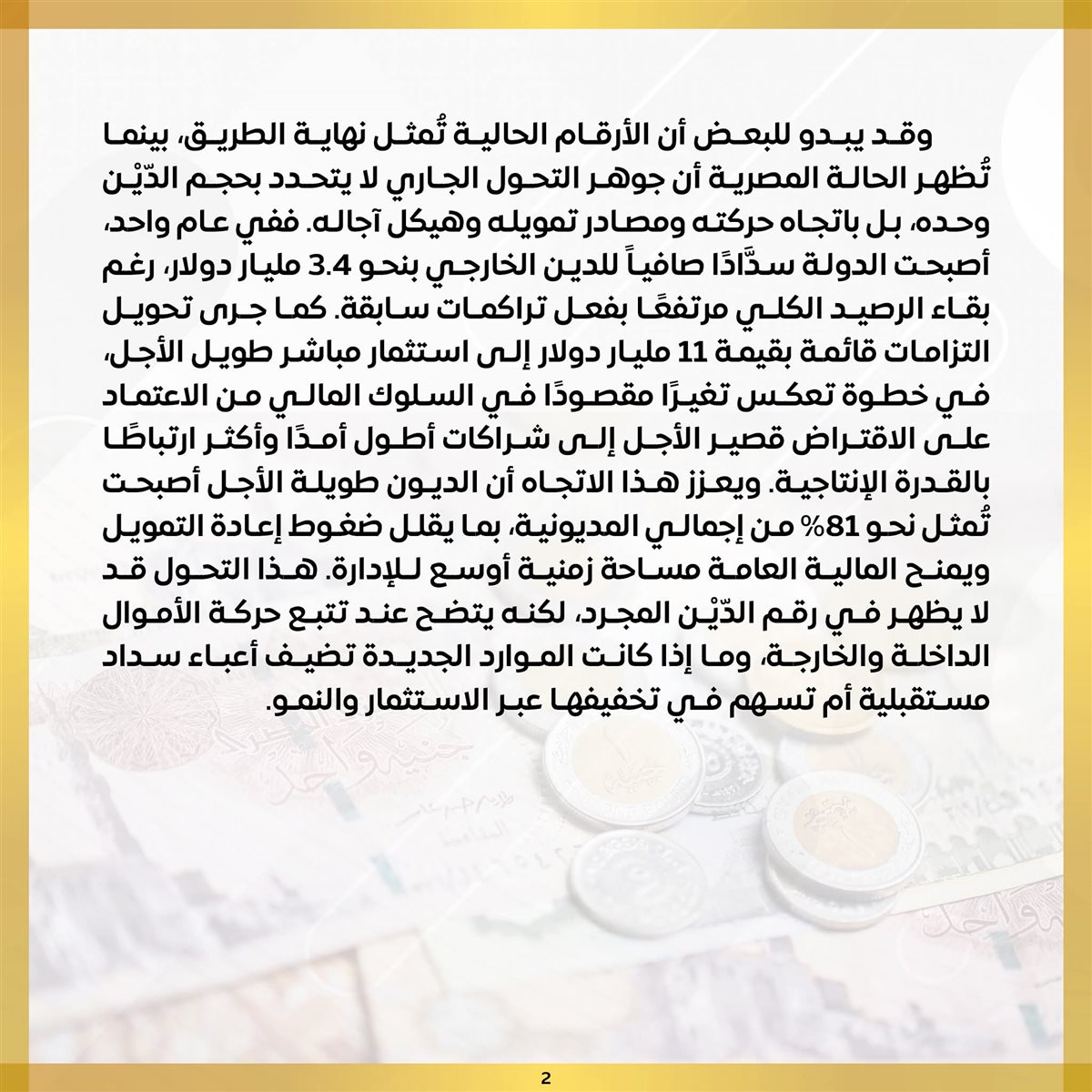 ومن هنا، يصبح السؤال الحقيقي أقل ارتباطًا بكم بلغ الدّيْن، وأكثر اتصالًا بكيفية إدارته، ولأي غرض يُستخدم، وكيفية توزيع كُلفته عبر الزمن، فالدّيْن الذي يضغط على الموازنة ويزاحم الإنفاق الاجتماعي يختلف جذريًا عن دَيْن يُعاد توجيهه أو يُستبدل بتدفقات استثمارية تخفف عبء السداد وتدعم النمو. وبين هذين النموذجين تعمل الدولة اليوم، في مسار معقد لا يخلو من كُلفة، لكنه يعكس توجهًا مقصودًا للانتقال من منطق التمويل الطارئ إلى منطق الاستدامة والانضباط المالي.