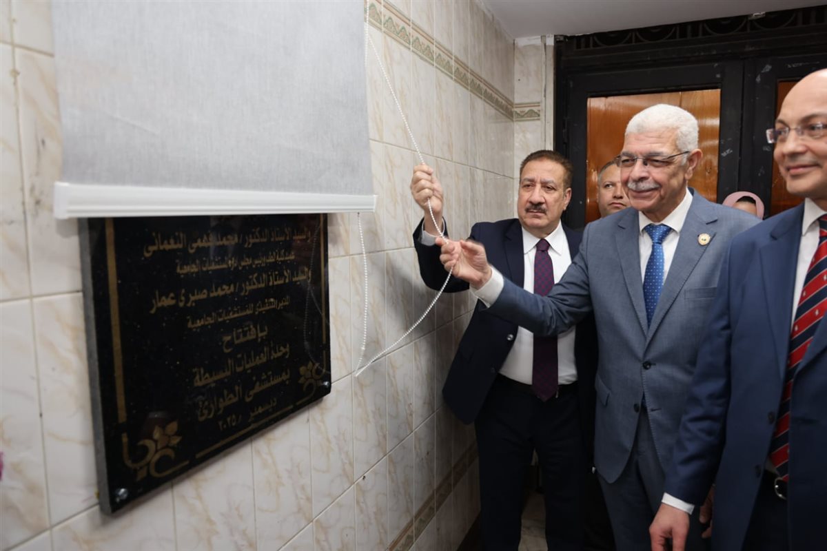 حيث أزاح محافظ المنوفية ورئيس الجامعة الستار عن اللوحة التذكارية للمنشآت الطبية الجديدة بمستشفى الطوارئ بالجامعة والتي تضمنت (وحدة عمليات الجراحة العامة )باستثمارات 6 مليون و500 ألف جنيه مكونه من ٦ عرف عمليات على مساحة 750م2 ، وتشمل تخصصات متعددة ( جراحه عامه وأورام وتجميل وغرفه إفاقه وغرف أطباء وتمريض ومخازن ، بالإضافة إلى افتتاح وحدة الجراحة باستثمارات مليون و250 ألف جنيه على مساحة 120م2 تضم غرفه رئيسية بها ٧ أسره وغرفه للحالات الحرجة بـ٢ سرير وغرفه كشف تم تصميمهم بأعلى معايير الجودة.