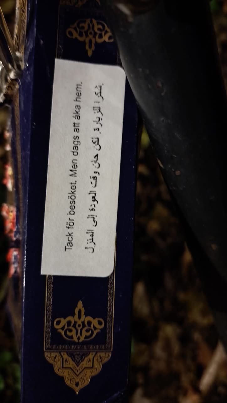 وبحسب المعطيات المتوفرة، جرى اكتشاف المصحف قرابة الساعة الخامسة مساءً، أي قبل نحو ساعة من موعد صلاة العشاء، في وقت كانت المدينة تشهد حلول الظلام المبكر. كما وُضعت على المصحف ورقة لاصقة كُتب عليها باللغتين العربية والسويدية: «شكرًا للزيارة، لكن حان وقت العودة إلى المنزل»، في عبارة تحمل دلالات إقصائية ومسيئة.