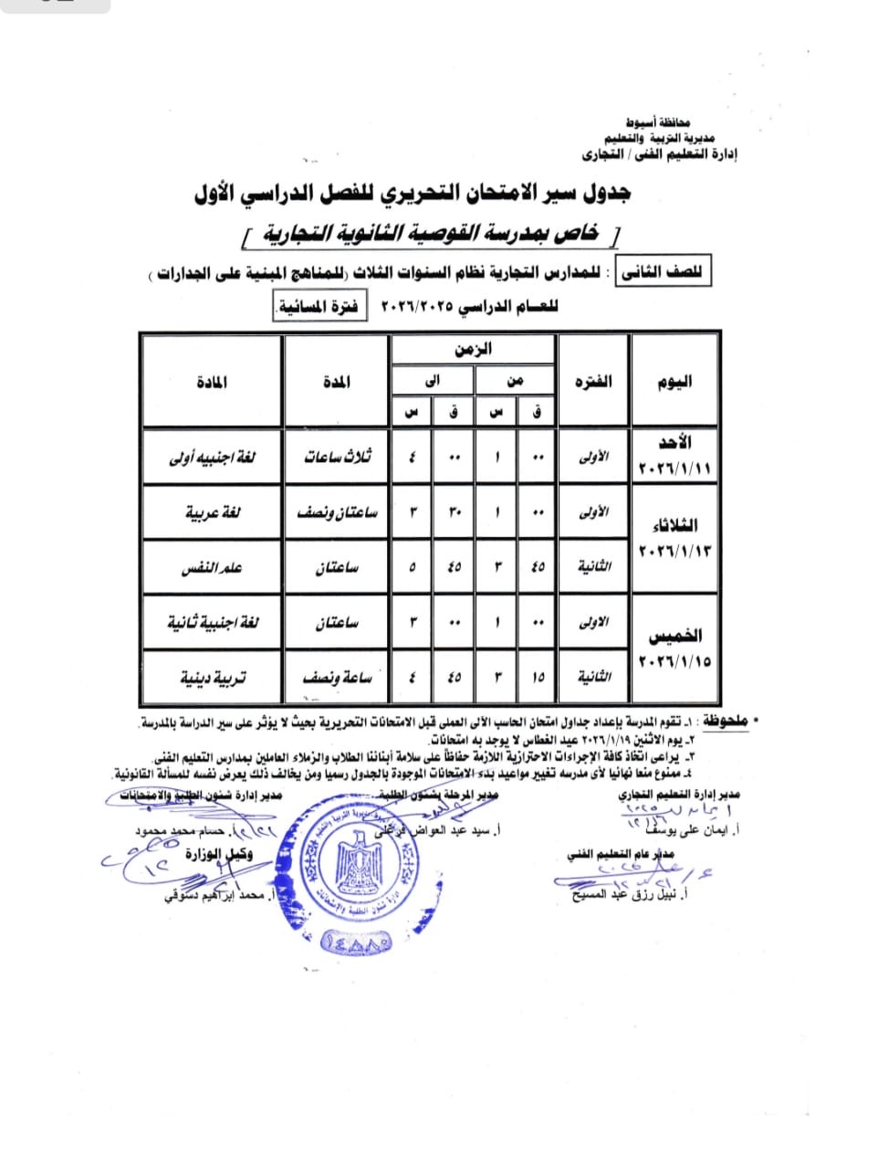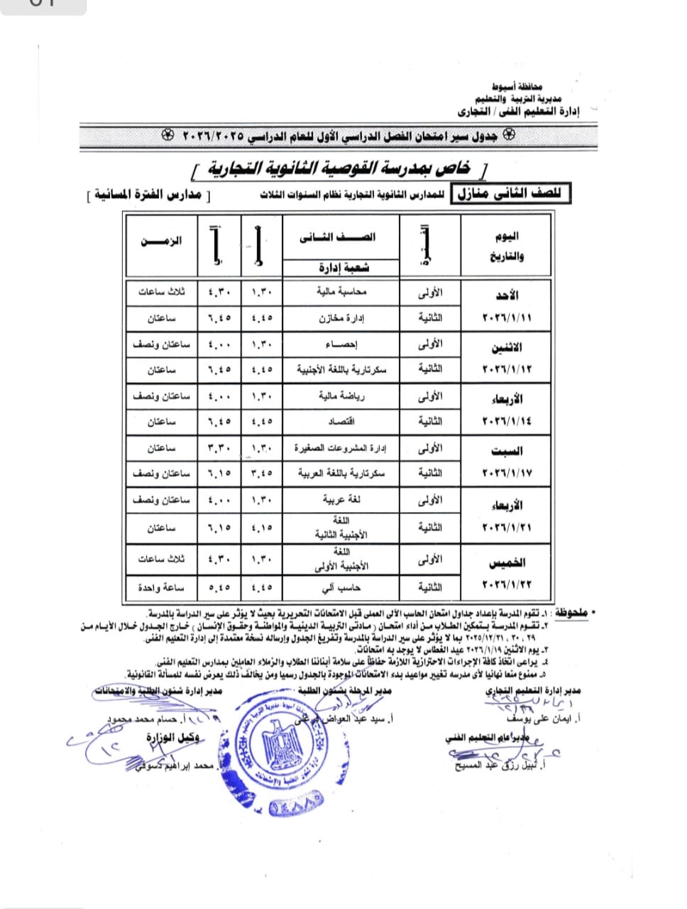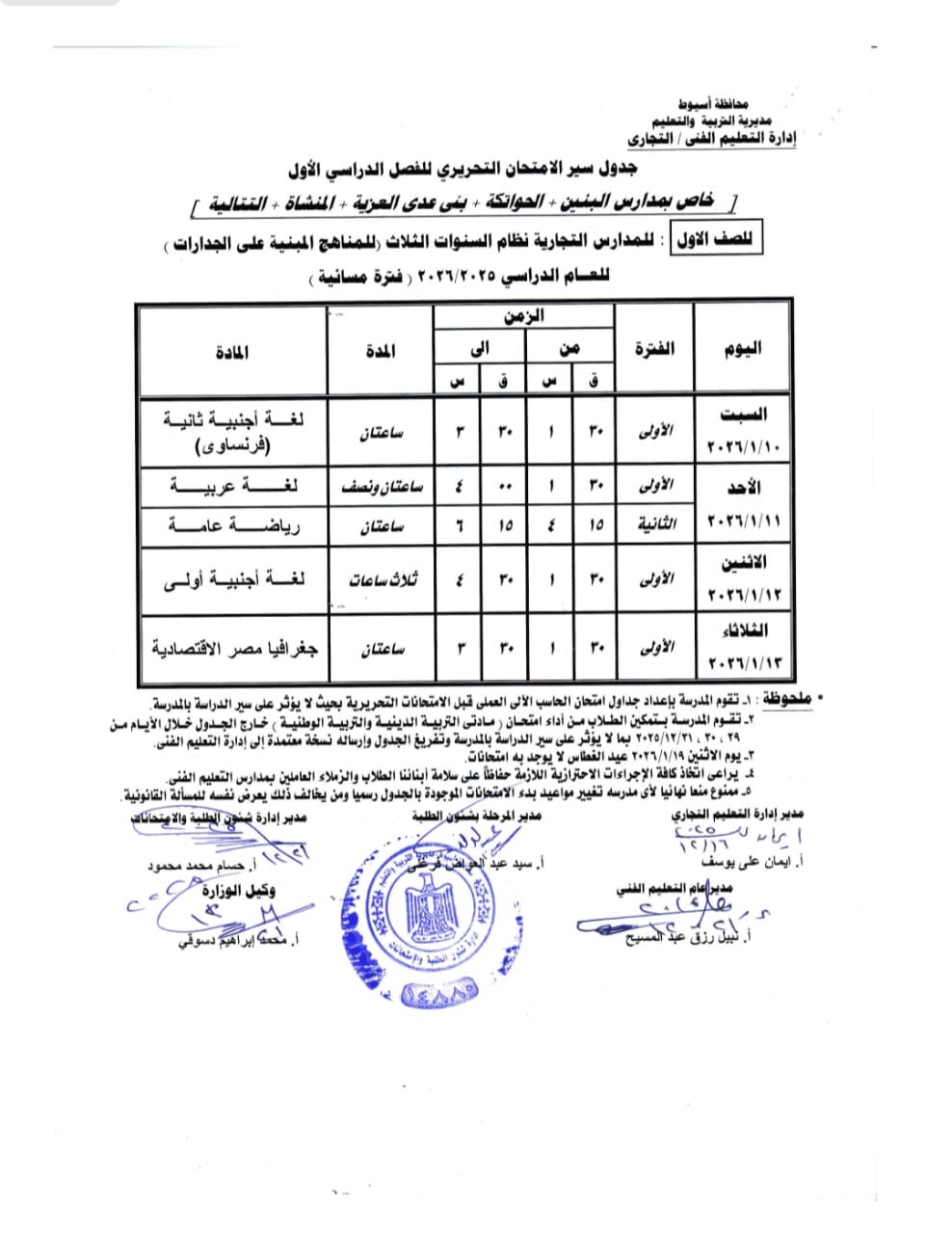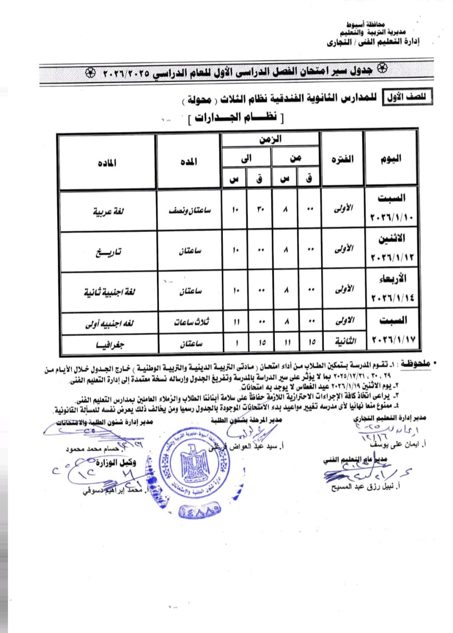اعتمد محمد ابراهيم دسوقى وكيل وزارة التربية والتعليم بأسيوط اليوم الأحد جداول امتحانات الفصل الدراسى الأول للعام الدراسى ( 2025-2026) للصفوف الدراسية بمختلف مراحل التعليم ( الابتدائية - الإعدادية - الثانوية ) بالإضافة إلى التعليم الفنى بمختلف مراحله ومدارس التربية الخاصة والتعليم المهنى ومدارس المجتمع ونظام الجدارات.
