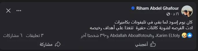 وعبرت ريهام عبد الغفور عبر حسابها على فيس بوك قائلة: "كان يوم أسود لما بقى في تليفونات بكاميرات، إدت الفرصة لشوية كائنات حقيرة تتغذى على أهداف رخيصة".