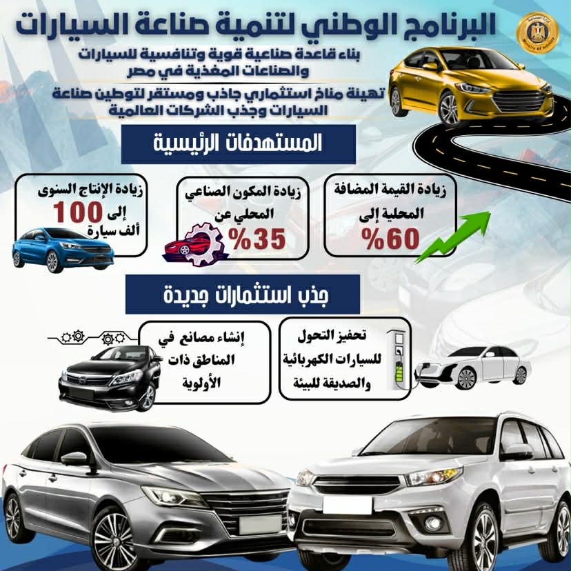 ويسعى البرنامج الذي يمتد لسبع سنوات، إلى تحقيق مستهدفات طموحة تشمل رفع القيمة المضافة المحلية إلى 60%، وزيادة نسبة المكون الصناعي المحلي المستهدف إلى أكثر من 35%، ورفع الإنتاج السنوي إلى 100 ألف سيارة، إلى جانب جذب استثمارات جديدة، وتحفيز التحول نحو السيارات الكهربائية والصديقة للبيئة، وإنشاء مصانع في المناطق ذات الأولوية التنموية.