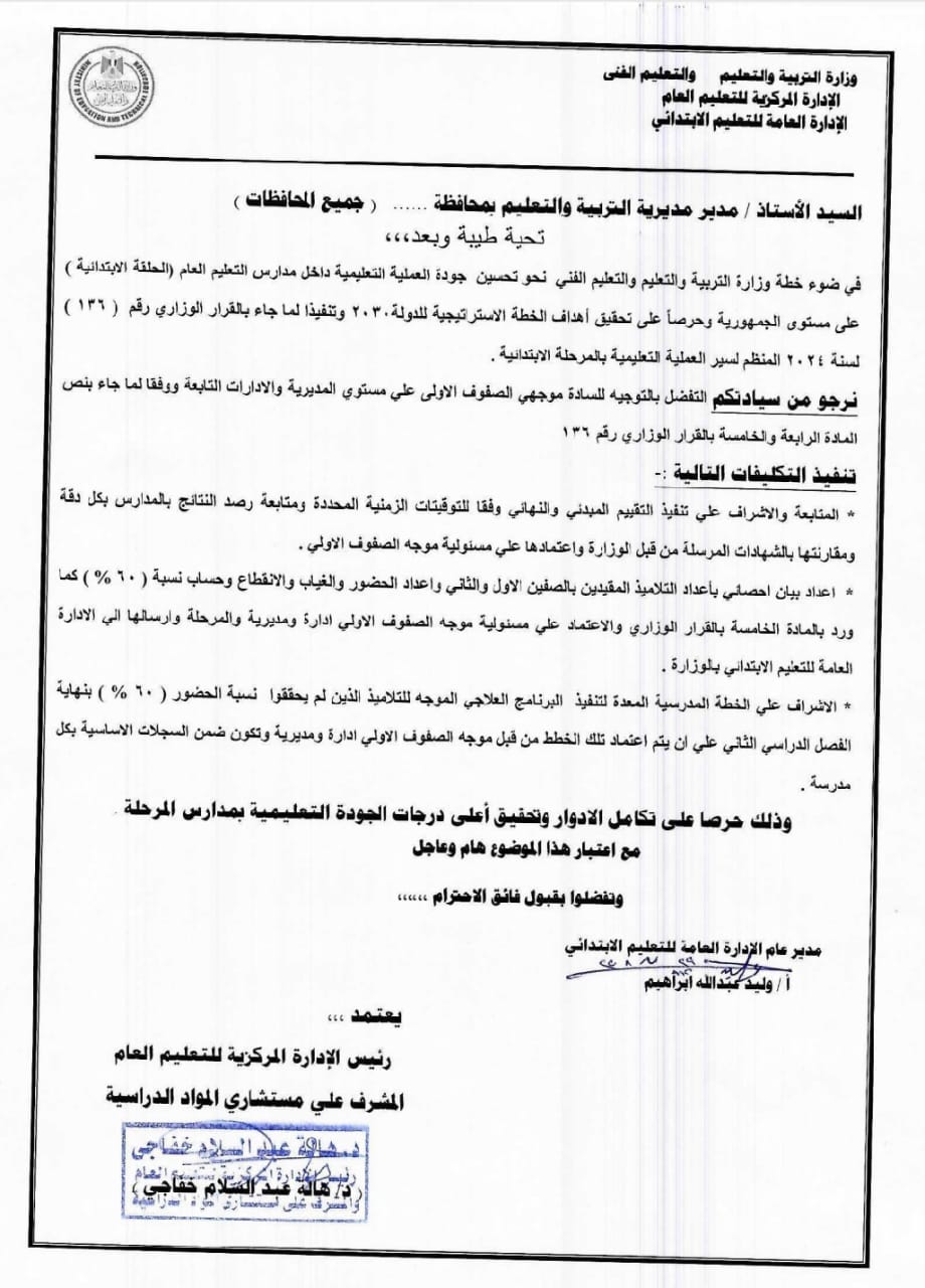 - إعداد بيان إحصائي شامل يتضمن أعداد التلاميذ المقيدين في الصفين الأول والثاني الابتدائي، مع تفصيل أعداد الحضور والغياب والانقطاع، وحساب نسبة الحضور (60%)، ثم اعتماده على مستوى الإدارة والمديرية والمرحلة، وإرساله إلى الإدارة العامة للتعليم الابتدائي بالوزارة.