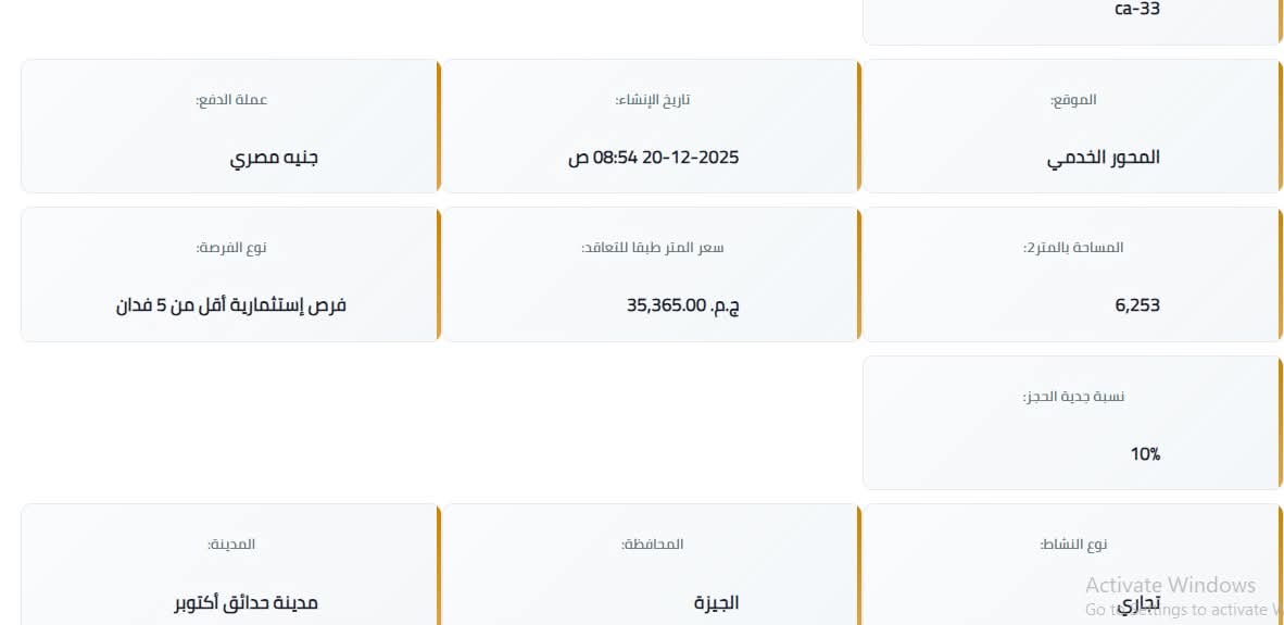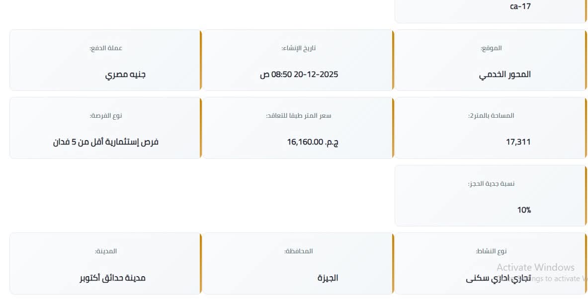 وأضاف رئيس الجهاز، أن الفرصة الاستثمارية الأولى تشمل قطعة أرض بمساحة 17,311 مترًا مربعًا تقع بالمحور الخدمي، مخصصة لنشاط تجاري – إداري – سكني، بسعر 16,160 جنيهًا للمتر المربع. أما الفرصة الثانية فهي لقطعة أرض بمساحة 6,253 مترًا مربعًا بالمحور الخدمي أيضًا، مخصصة لنشاط تجاري، بسعر 35,365 جنيهًا للمتر المربع.